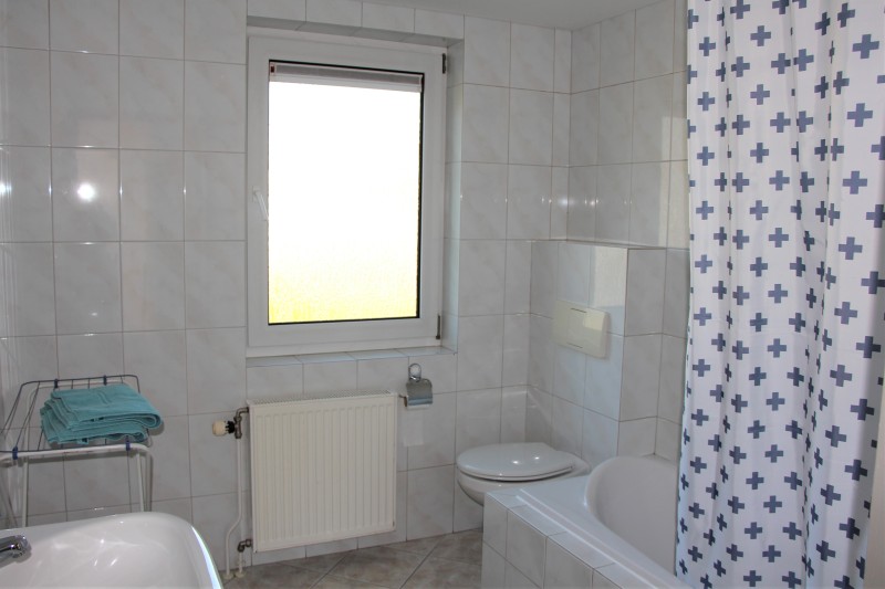• Badkamer met ligbad/douche, wastafel en toilet