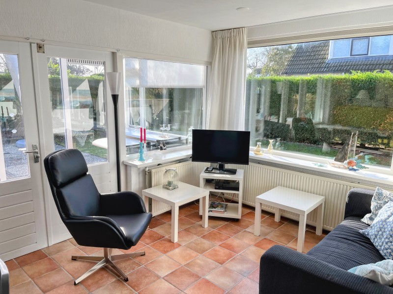 Het zitgedeelte heeft een 3-persoonsbank en twee losse stoelen. Twee losse bijzettafels maken de indeling flexibel. Flatscreen TV met daarop aangesloten een CD/DVD speler. TV en Internet zijn aangesloten op het netwerk van Noordzeepark. Het eetgedeelte bestaat uit een ruime grenen eettafel met 6 stoelen. Eet- en drinkgerei, bestek en glaswerk is in voldoende mate aanwezig. Aan de kamer zit een serre, die volledig bij de kamer getrokken kan worden.