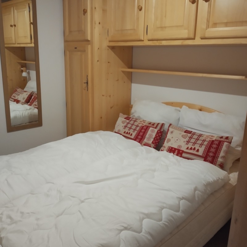 Kom binnen en de eerste deur leidt naar de 1ste slaapkamer met een stapelbed met kledingkast. De 2de slaapkamer heeft een tweepersoonsbed. Er tegenover ligt de badkamer met inloopdouche, toilet en wastafel. Loop een paar stappen verder en u bevindt zich in de modern ingerichte woon/eetkamer.