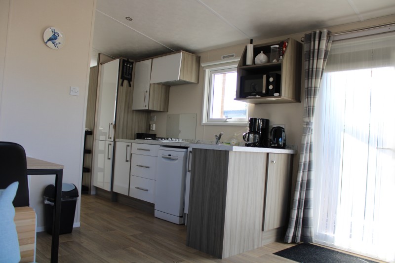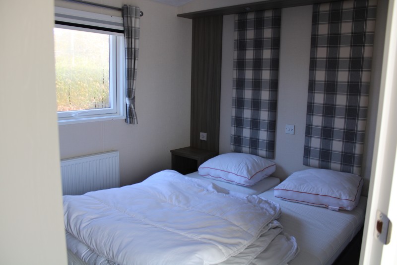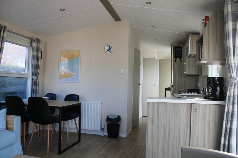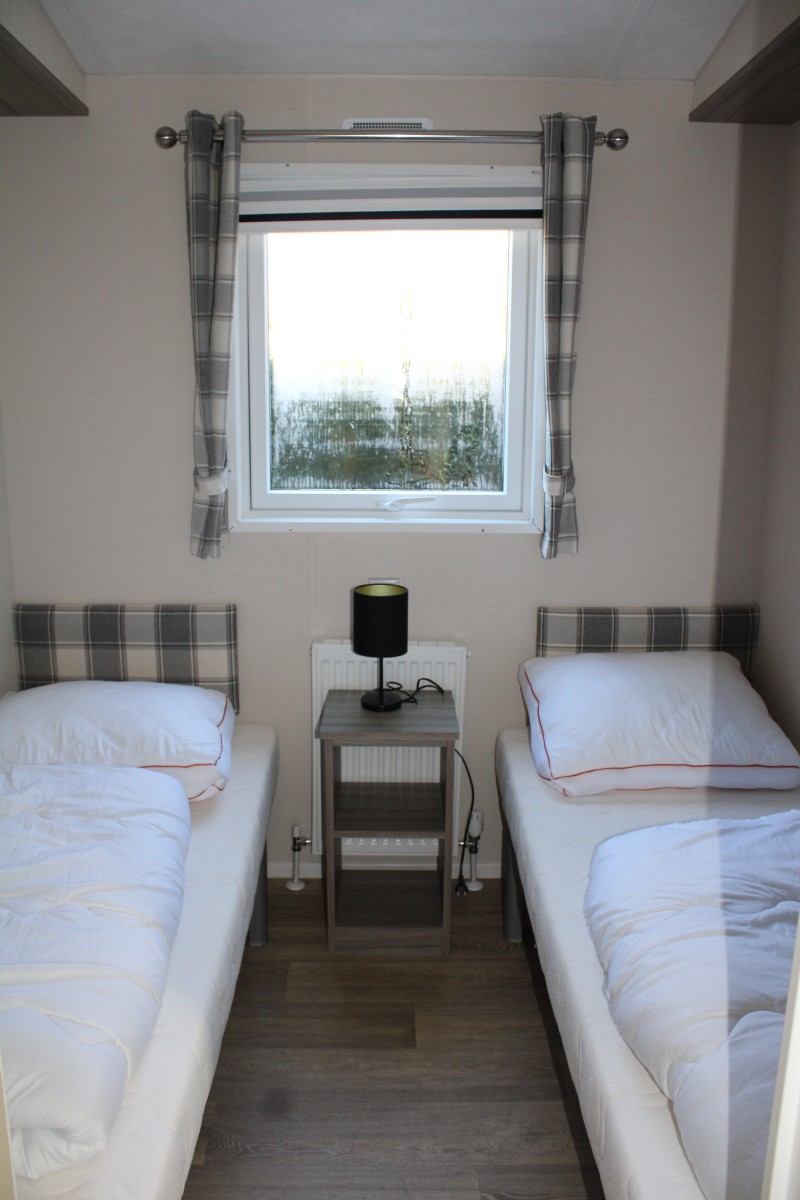 Woongedeelte, keuken/ eettafel en 2 slaapkamers: 1 slaapkamer met een tweepersoonsbed en 1 slaapkamer met 2 losse (volwassen) bedden. In het chalet is een airco, vaatwasser en wasmachine aanwezig.
