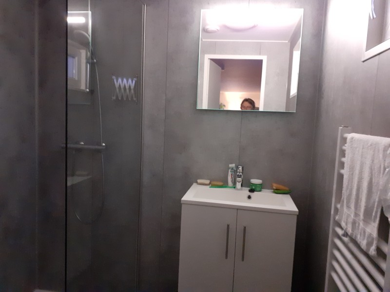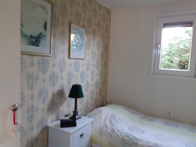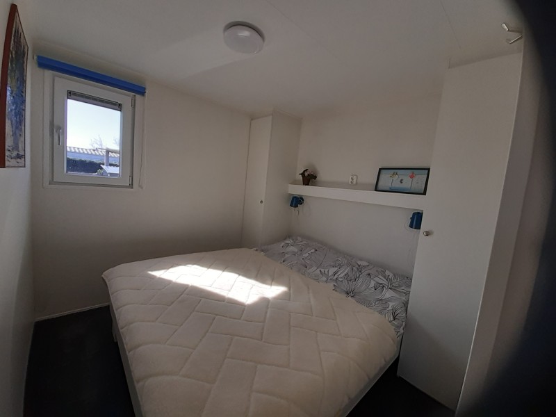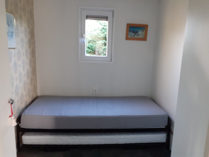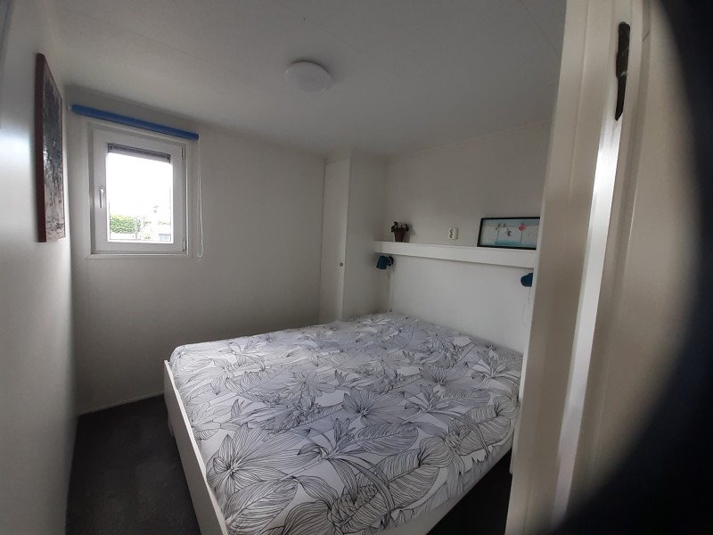 Het chalet heeft een ruime veranda, een 2 persoons slaapkamer, een 1 persoons slaapkamer en nog een kleine 1 persoons slaapkamer waar ook de wasmachine staat.